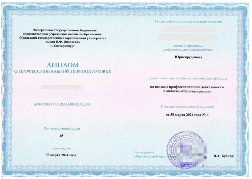 По окончанию онлайн курса Вы получите Диплом  о профессиональной переподготовке УрГЮУ им. В.Ф. Яковлева,  зарегистрированный в реестре документов об образовании Министерства науки и высшего образования РФ (ФИС ФРДО).